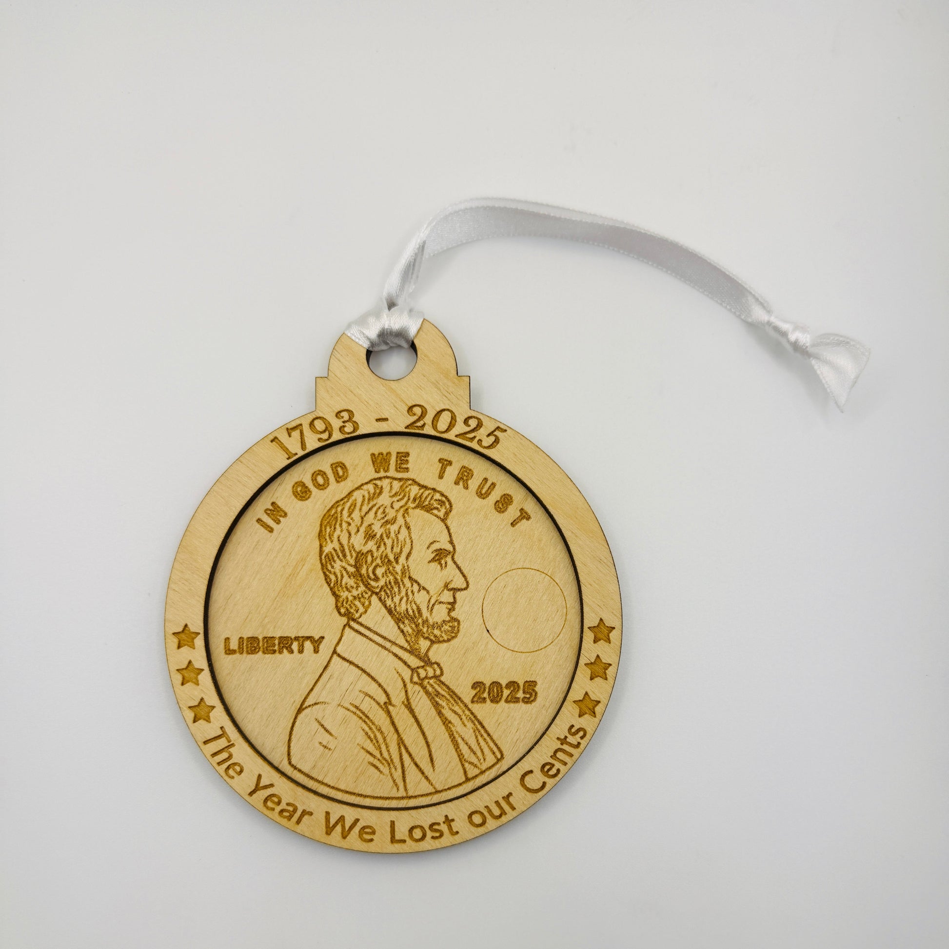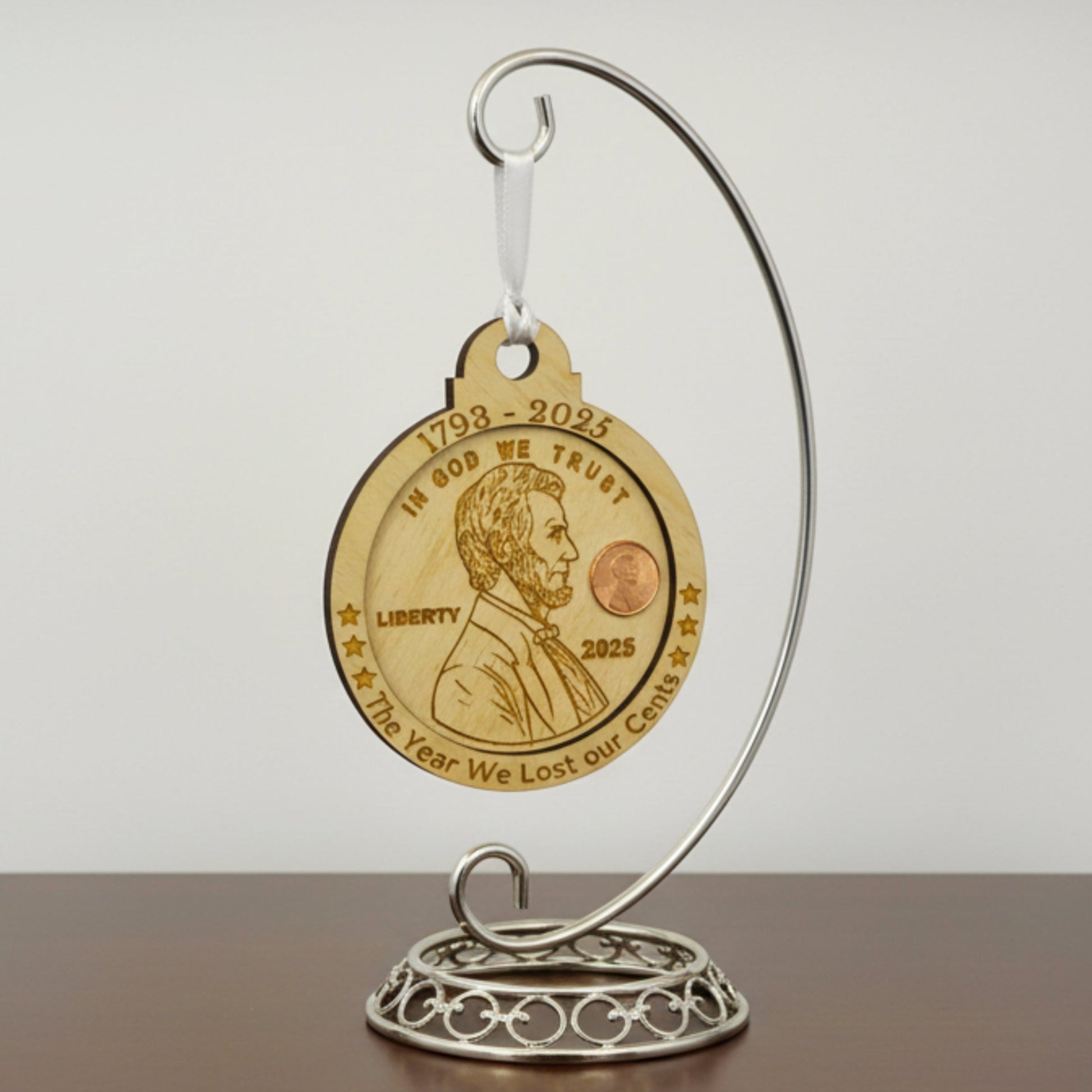 Commemorate a historic moment with this charming wooden penny ornament celebrating the end of an era. Shaped like the iconic US cent and engraved with "The Year We Lost Our Cents," this keepsake marks 2025—the final year pennies rolled off the mint after 232 years of production. A witty tribute to numismatic history and a nostalgic nod to the humble one-cent piece that's been part of American pockets since 1793. Perfect for collectors, history buffs, and anyone who appreciates a good pun.