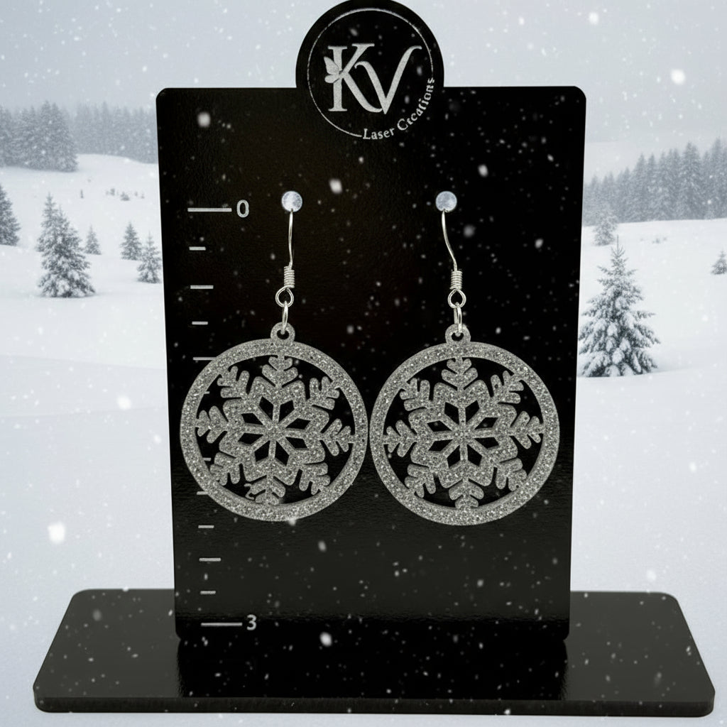 These Snowflake Earrings feature a circle design with an intricate snowflake cutout, crafted from lightweight glitter acrylic. Their shimmering finish catches the light beautifully, offering a subtle sparkle that complements any winter-inspired look without added weight or discomfort. Ideal for those seeking elegant seasonal accessories with refined craftsmanship.