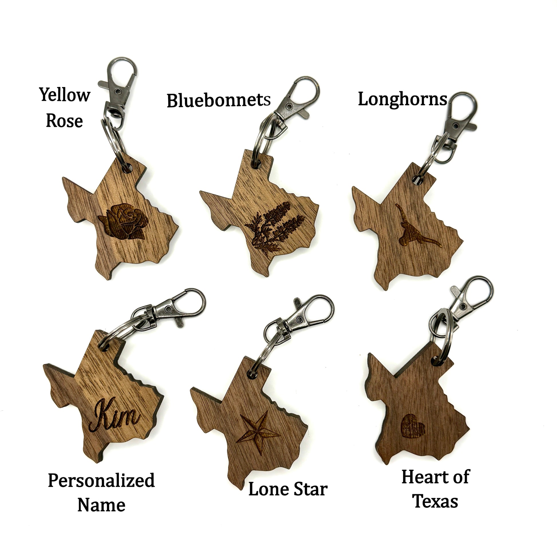 Texas-shaped walnut keychains featuring premium 1/4 inch walnut wood and durable black keychain clip hooks. Choose from iconic Texas symbols—Bluebonnets, Yellow Rose, Lone Star, Longhorn, or Heart—or personalize with your name. Upgrade to dual-sided engraving with a symbol on one side and custom name on the reverse. Each keychain is proudly made in Texas, perfect for locals and Texas enthusiasts alike.