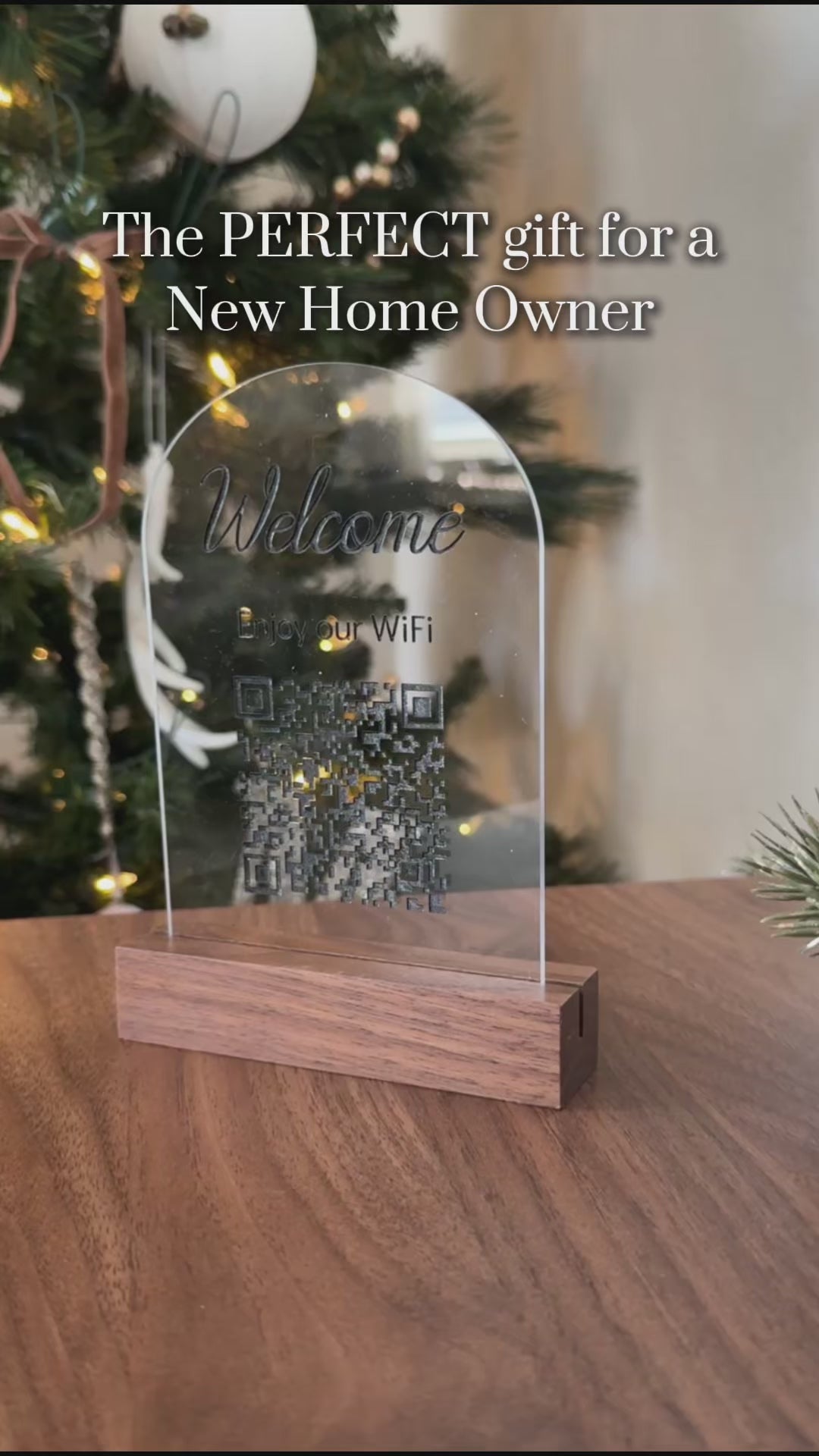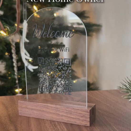 This WiFi QR Sign features a choice of frosted or clear acrylic arched panel elegantly mounted on a natural oak or walnut wood base. Designed for easy visibility, it allows guests to quickly scan and connect to your wireless network without hassle. Its minimalist style enhances any environment, making it perfect for homes and businesses seeking a professional yet functional display. This sign efficiently blends practicality with aesthetics in any setting.